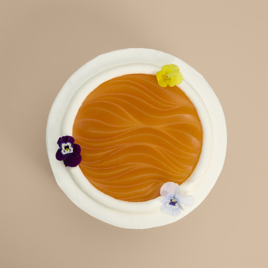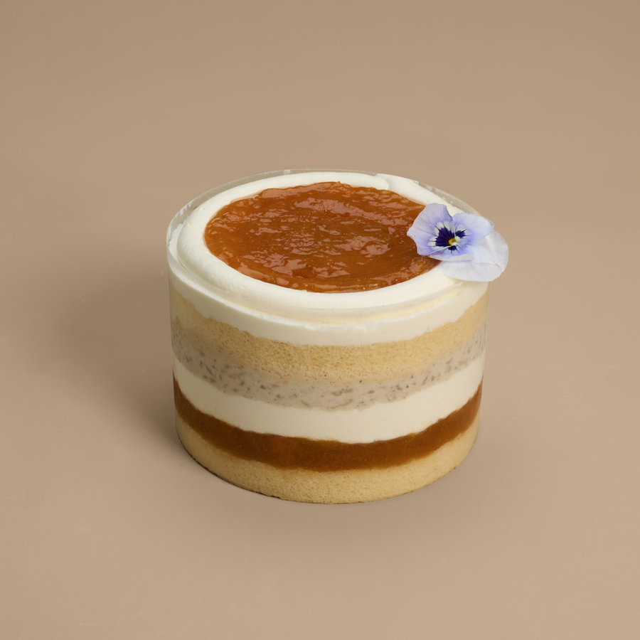 A delicate harmony of flavours and textures — layers of soft Japanese chiffon sponge filled with Earl Grey rice pudding, house-made apricot jam, and silky apricot jelly. Finished with fresh Elle & Vire cream for a light yet luxurious finish