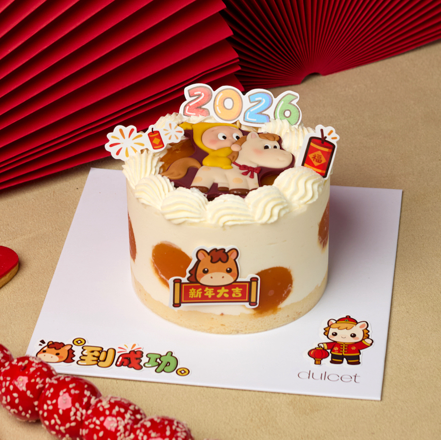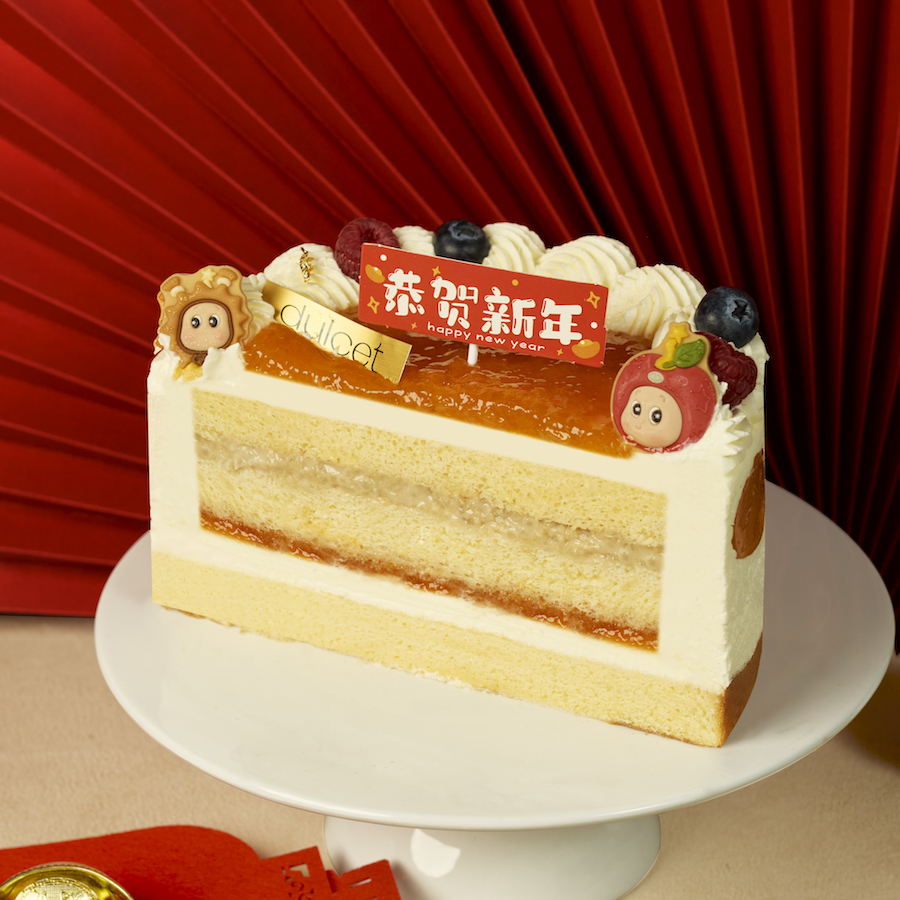 A light Japanese-style chiffon cake layered with fragrant Earl Grey rice pudding and bright house-made apricot compote, finished with Chantilly cream and playful Chinese New Year “Twinkle Twinkle” chocolate decorations. A delightful balance of elegance and joy — perfect for festive celebrations and gifting.