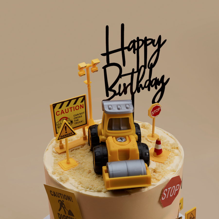 Caution: Fun ahead! This playful cake is topped with your choice of a toy excavator or road roller, surrounded by traffic signs, cones, and edible dirt. Perfect for little builders with big birthday dreams!