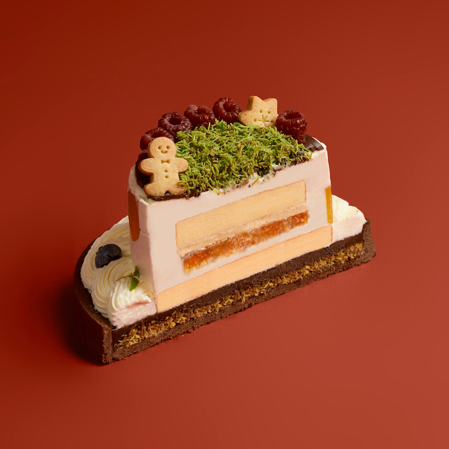 A luxurious Christmas creation featuring pistachio-infused Dubai chocolate filling, layered with dark chocolate ganache, house-made apricot jam, and dark chocolate chiffon sponge, all encased in a crisp dark chocolate tart shell.